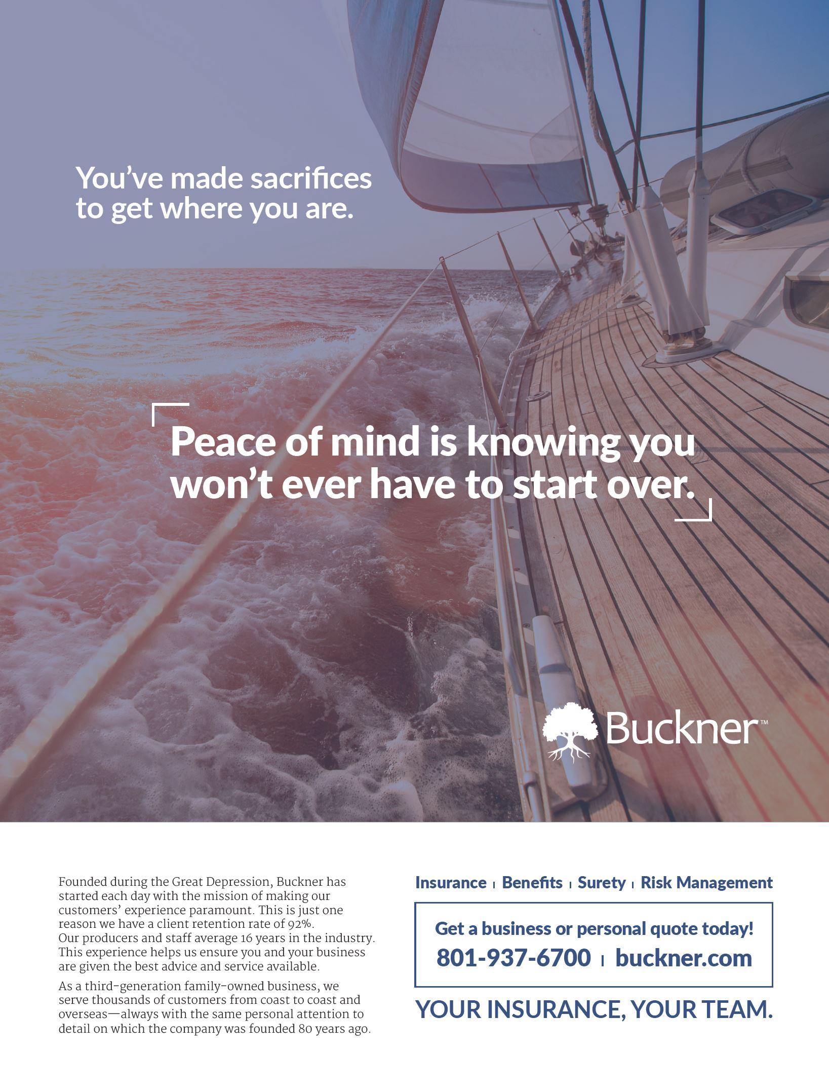An ad created for The Enterprise - Utah's Business Journal. The sailboat was an attention grabber that also tied into the personal insurance side of Buckner. Because this was running with many other business-to-business ads, I chose something unexpected to catch perusing eyes. The headlines focus on security and peace of mind. These are two of the main benefits considered when weighing the cost of insurance.